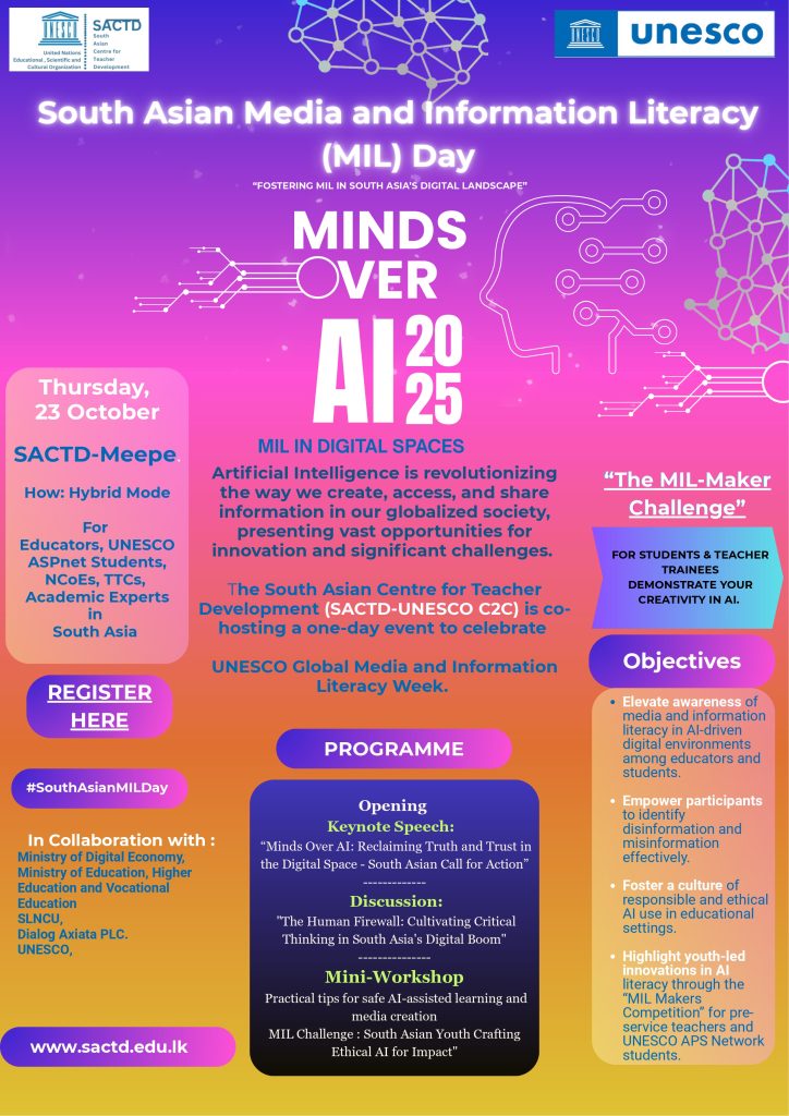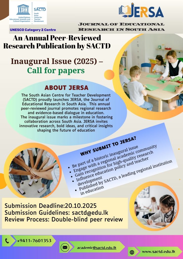 The South Asian Centre for Teacher Development (SACTD) is a UNESCO Category 2 Centre located in Meepe, Sri Lanka, dedicated to transforming teacher education across South Asia. Established through the partnership between UNESCO and the Government of Sri Lanka, SACTD contributes to achieving Sustainable Development Goal 4 by promoting inclusive, equitable, and high-quality education.